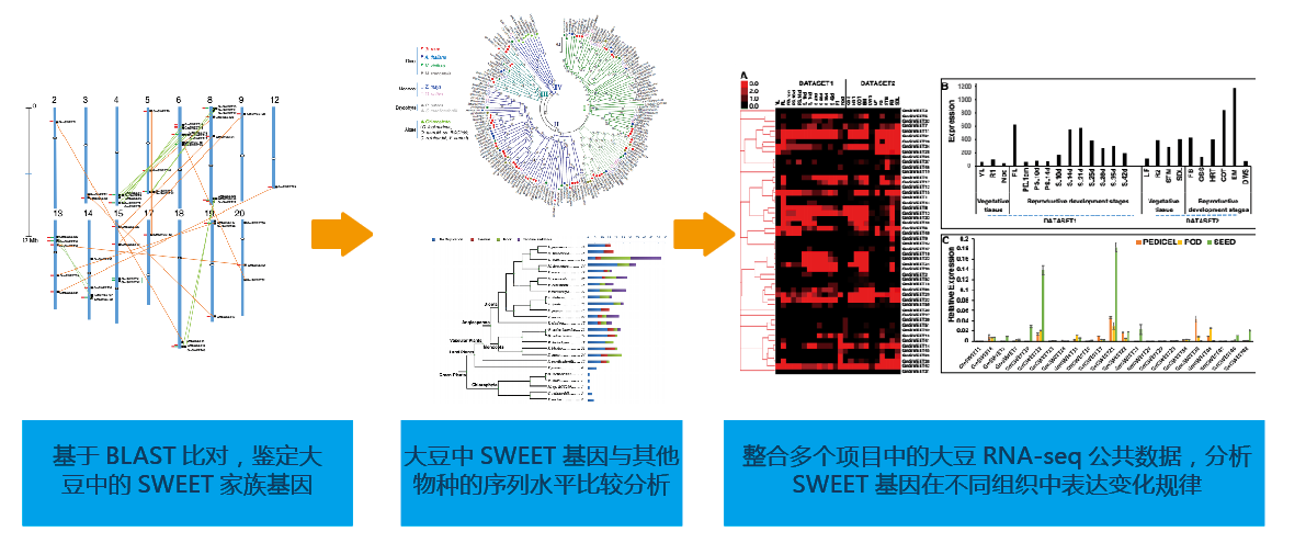 整個多個大豆RNA-seq公共數(shù)據(jù),分析SWEET基因家族在大豆生殖組織與營養(yǎng)組織間表達(dá)變化規(guī)律