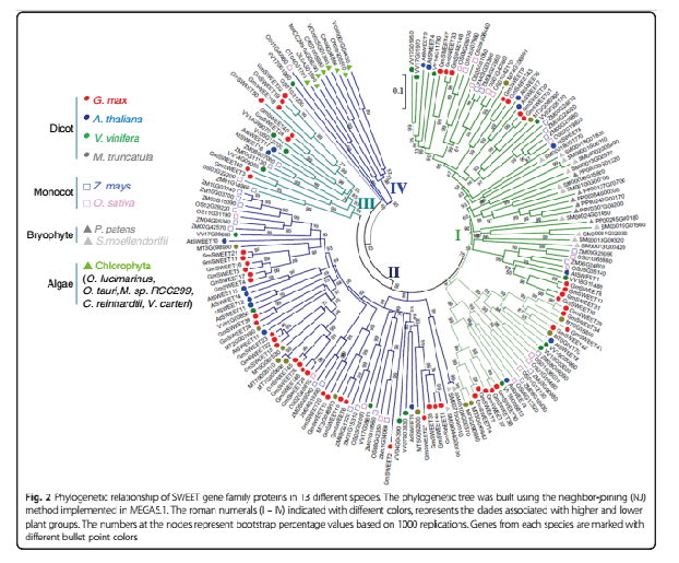 為了了解不同物種中SWEET家族基因的進(jìn)化關(guān)系,研究者對大豆中的SWEET家族基因與其他13個物種(包括水稻、擬南芥、玉米在內(nèi))中的SWEET基因構(gòu)建系統(tǒng)進(jìn)化樹。