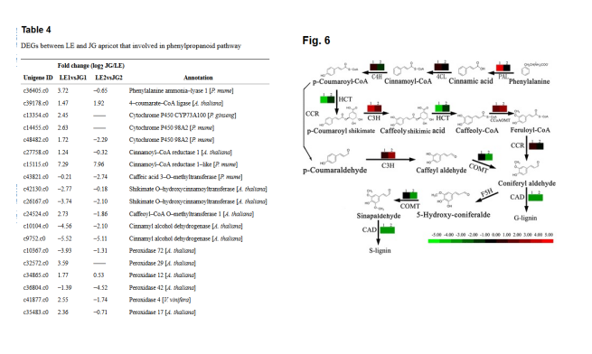 a)LE品種內(nèi)果皮破裂與發(fā)育不全是一個非常復(fù)雜的表型,與眾多的代謝通路相關(guān),但類苯基丙烷相關(guān)通路是眾多代謝通路中已經(jīng)證實的非常重要的一個。該項目中對兩個品種在兩個時間點的差異表達基因的KEGG富集分析結(jié)果也證實了上述事實,所以差異基因顯著富集于類苯基丙烷代謝、合成等通路。類苯基丙烷相關(guān)通路相關(guān)差異表達基因見列表4與圖6。