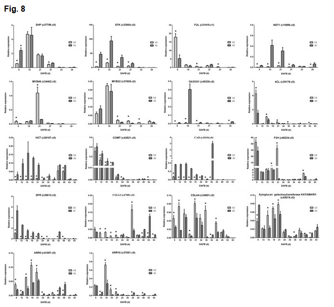 b)一些轉(zhuǎn)錄因子也被報道與內(nèi)果皮發(fā)育相關(guān),包括SHP 、 STK、ALC、IND、FUL、RPL、NST1、NST3以及一些MYB家族轉(zhuǎn)錄因子。該項目中,SHP, FUL, MYB32 ,STK, MYB46–1, MYB46–2, ?NST1 也包含在兩個品種間的差異表達基因列表中,也發(fā)現(xiàn)了上述部分基因差異表達方向與預(yù)期不符。