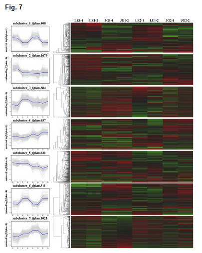 a)文章最后,使用K-means聚類對之前得到的差異表達基因進行了共表達分析,分析結(jié)果顯示:基于表達趨勢,所有差異基因可劃分為7個cluster,每個cluster內(nèi)部的基因具有相似的表達趨勢,也就可能在細胞內(nèi)行駛著相似的功能,聚類結(jié)果見圖7。 b)之前分析得到的內(nèi)果皮發(fā)育相關(guān)基因大多分布在cluster1或者cluster6,cluster1中的基因在LE品種中高表達,JG品種低表達,cluster6與cluster1相反。