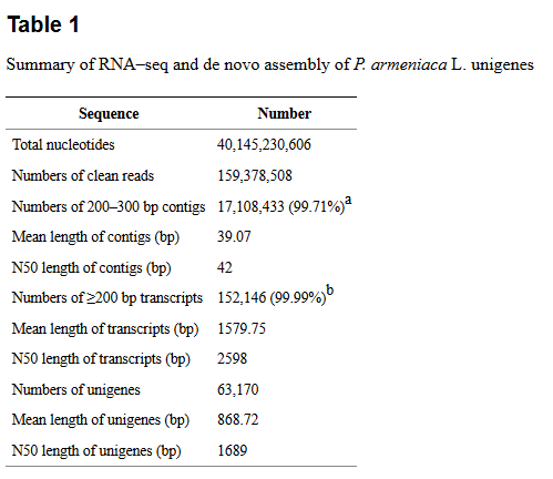 a)測序取樣部位 : 去核后的果實,每個品種兩個生物學(xué)重復(fù) 測序取樣時間點 : 根據(jù)上一部分的表型觀察結(jié)果,LE品種內(nèi)果核在15DAFB時出現(xiàn)裂縫,在24DAFB時,裂縫程度開始快速增大,因此,該mRNA測序項目選擇了15DAFB和24DAFB兩個時間點樣本 b)轉(zhuǎn)錄本組裝:測序共得到~20Gbase clean data,使用Trinity軟件組裝得到63,170條unigene,unigene N50大小1689bp,詳細組裝結(jié)果參見表1。