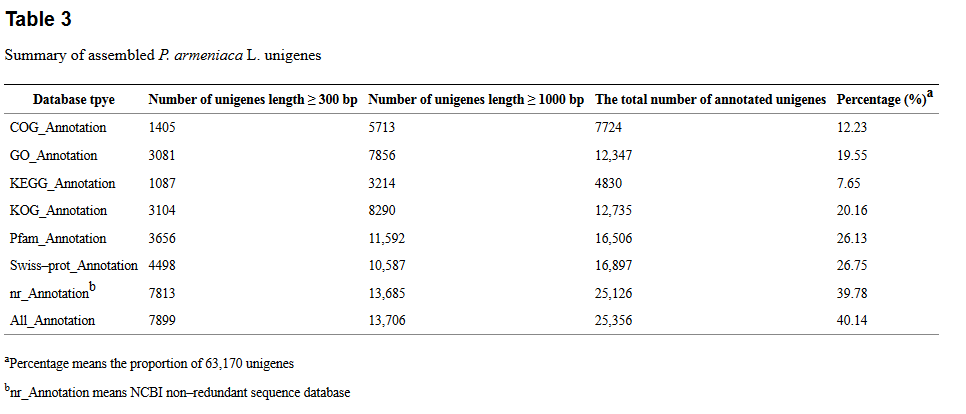 a)基于blast比對,63,170條unigene中有25,356可比對到日本杏(Japanese apricot)與桃(peach)基因組數(shù)據(jù)庫。 b)使用BLASTx(e-value閾值設(shè)為10e-5)將上述25,356條unigene比對到NR, Swiss-Port, GO, COG, KOG ,kegg數(shù)據(jù)庫以進行功能注釋,每條unigene均有多條注釋,詳細的注釋結(jié)果統(tǒng)計信息請參見表3. c)GO數(shù)據(jù)庫注釋過程中,16,506條unigene被注釋到,其中, ‘metabolic process’ (8408 genes, 50.93%)是被注釋到最多的GO 條目;KEGG數(shù)據(jù)庫注釋過程中,4830條unigene被注釋到了118個代謝通路。大部分的unigene被注釋到了‘carbohydrate metabolism’ (905 genes), ‘translation’ (596 genes), ‘a(chǎn)mino acid metabolism’ (581 genes), or ‘folding, sorting and degradation’ (471 genes)等代謝通路。