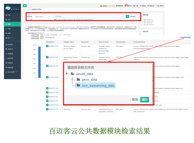 1)下載大豆RNA-seq公共數(shù)據(jù)集: 數(shù)據(jù)集1 SRA數(shù)據(jù)庫編號:PRJNA140081. 包含14個樣本,其中11個樣本為生殖組織來 源(花、豆莢、種子),3個為營養(yǎng)組織來源(葉、根、根瘤) 數(shù)據(jù)集2 GEO數(shù)據(jù)庫編號: GSE29163. 包含10個樣本,其中6個樣本為生殖組織來源(花、花芽、種子),4個樣本為營養(yǎng)組織來源(根、莖、葉、幼苗) 該步驟可進(jìn)入BMKCloud_數(shù)據(jù)庫模塊按數(shù)據(jù)編號完成數(shù)據(jù)檢索及一鍵保存,保存后的數(shù)據(jù)可直接調(diào)用百邁云平臺的分析模塊BMKCloud_APP進(jìn)行后續(xù)分析。