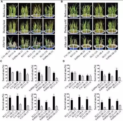 分別取XL22、CA1-OE、SAPK6-OE、KY-131-N的4葉齡種子材料,每個3個生物學(xué)重復(fù),均進(jìn)行42℃ 12小時,4℃5天處理,最后正常環(huán)境下生長7天,觀察這各材料之間的葉卷曲清苦以及存活率,結(jié)果顯示,XL22表現(xiàn)為個更高的存活率(圖5C),更加輕微的葉片卷曲(圖4A),表明XL22相較于單基因轉(zhuǎn)化株與非轉(zhuǎn)基因株擁有更強的耐熱、抗寒能力。