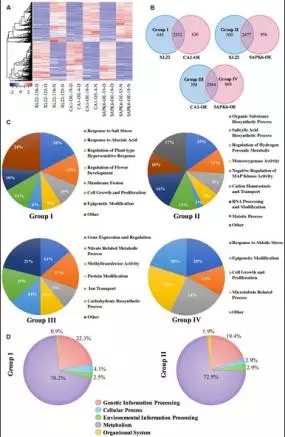 c)由于轉(zhuǎn)基因材料中過表達(dá)基因為bZIP家族轉(zhuǎn)錄因子及其活性激活基因家族,研究者重點關(guān)注了3個材料中轉(zhuǎn)錄上調(diào)的基因,這些基因被劃分為4類:Group1,XL22相較于CA1-OE特有上調(diào)基因,645個;Group2,XL22相較于SAPK6-OE特有上調(diào)基因,500個基因特異上調(diào);Group3,CA1-OE相較于SAPK6-OE特有上調(diào)基因,398個;Group4,SAPK6-OE相較于CA1-OE特有上調(diào)基因,869個。Group I主要分布在“Response to ABA”、“Regulation of Plant-type Hypersensitive response”等GO term;Group II主要分布在“Organic Substance Biosynthetic Process” 、“Salicylic Acid Biosynthetic Process” 、“Regulation of Hydrogen Peroxide Metabolic Process”等GO term;Group3主要分布在“Gene Expression and Regulation”、 “Nitrate Related Metabolic Process” 、 “Carbohydrate Biosynthetic Process” 等GO term;Group4主要分布在 “Cytokinesis and Cell Proliferation”、“Microtubule Related Process”、“Response to Abiotic Stress” 等GOterm(見圖6C)。因此推測,XL22中的兩個基因可能激活了不同的干旱脅迫應(yīng)答基因。