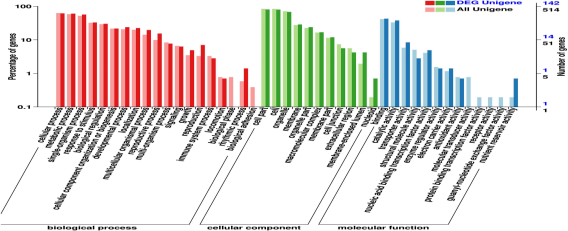 GO分類中大多數(shù)DEGs聚類到細(xì)胞過程(61.97%),繁殖過程(15.49%),結(jié)合過程(42.96%)(圖5)。