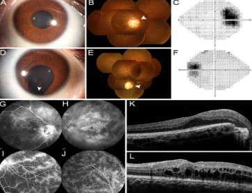 患者是一名14歲男性,攜帶常染色體隱性遺傳病,生于近緣家族,全面眼科檢查顯示其最近左眼視力逐漸喪失,雙眼出現(xiàn)輕微白內(nèi)障癥狀。眼前段裂隙燈檢查顯示右眼正常(圖1A),但左眼6點(diǎn)鐘方向虹膜缺損(圖1D)。眼底檢查右眼視神經(jīng)盤缺損(圖1B),左眼脈絡(luò)膜缺損(圖1E)。在視覺范圍上,右眼生理盲區(qū)擴(kuò)大(圖1C),雙眼視覺對比敏感度低(圖1C,F(xiàn))。其他家庭成員沒有OC或眼部畸形。除OC表型外,眼底熒光血管造影(FFA)和光學(xué)相干斷層掃描(OCT)結(jié)果提示患雙側(cè)視網(wǎng)膜血管炎和繼發(fā)性視網(wǎng)膜劈裂癥(圖1G,H,K和L)。接受2個月激素治療后,雙眼黃斑水腫逐漸消失(圖1I和J)。