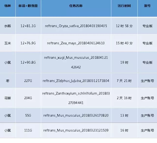 無(wú)參轉(zhuǎn)錄組分析數(shù)據(jù)表明,12個(gè)玉米樣本共76.9G,專業(yè)版賬號(hào)中最快可以在2天5小時(shí)完成交付。而在生產(chǎn)賬號(hào)中,山雀(36G)和蚱蜢(62G)最快可在1天16小時(shí)完成分析。