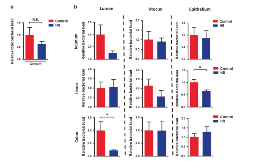 首先,研究人員檢查HS攝入是否會影響腸道細菌。慢性HS喂養(yǎng)后,盲腸中的總細菌負荷略有下降,但無顯著變化(圖1a)。慢性HS喂養(yǎng)后,回腸上皮(圖1b)和結(jié)腸腔內(nèi)(圖1b)的細菌負荷也降低。慢性HS處理顯著降低厚壁菌門和提高擬桿菌的水平,這表明細菌組合物在HS攝入后發(fā)生改變。