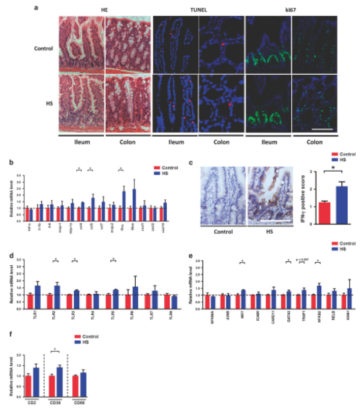 腸道生態(tài)失調(diào)通常與腸道病理生理學(xué)的改變有關(guān),研究人員檢查了慢性HS喂養(yǎng)對腸道變化的影響。在對照組和HS-喂養(yǎng)組小鼠的回腸和結(jié)腸上皮細胞形態(tài)沒有差異(圖3a)。此外,通過TUNEL和ki67染色鑒定的相似數(shù)量凋亡和增殖細胞表明,慢性HS喂養(yǎng)不影響腸道中的細胞死亡(圖3a)。然而,研究人員發(fā)現(xiàn)炎癥標志物表達被慢性HS攝入顯著改變。特別是,Ccl4,Ccl5和Ifn-γ在HS小鼠的回腸中表現(xiàn)出更高的mRNA水平(圖3b)。 IFN-γ免疫組織化學(xué)在回腸中的結(jié)果證實了基因表達數(shù)據(jù)(圖3c)。由于TLR家族蛋白和Nf-κB是參與病原體相關(guān)免疫應(yīng)答的主要分子,進一步評估TLR家族和Nf-κB基因表達,發(fā)現(xiàn)TLR2,TLR3和TLR5mRNA水平在回腸中趨于更高(圖3d)。同時,HS處理后IRF7,GATA3和NFKB2的表達顯著上調(diào)(圖3e)。此外,HS喂養(yǎng)后白細胞中CD38的表達在回腸中升高(圖3f)。然后通過RNA測序進行轉(zhuǎn)錄組分析,并比較涉及“細胞因子 – 細胞因子受體相互作用”,“ NF-κB信號通路“和”Toll樣受體信號通路“。在回腸和結(jié)腸中,兩組之間許多基因的表達是不同的。總的來說,這些數(shù)據(jù)表明慢性HS攝入導(dǎo)致腸炎癥反應(yīng)中斷。
