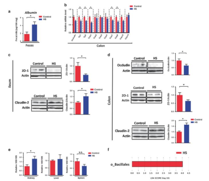 腸道免疫反應(yīng)受損始終與腸道屏障功能障礙有關(guān),研究人員研究了HS的攝入如何影響腸道屏障功能。HS攝入顯著降低了tjp-1,tjp-2,claudin-1,claudin-7和claudin-8基因的表達(圖4a)。 此外,與對照小鼠相比,HS攝入后,回腸和結(jié)腸中屏障形成的緊密連接ZO-1蛋白水平和結(jié)腸中的Occludin蛋白水平顯示出較低的趨勢(圖4c和d)。 另一方面,在HS喂養(yǎng)回腸和結(jié)腸后,成孔緊密連接蛋白Claudin-2蛋白水平顯著較高(圖4c和d)。這些數(shù)據(jù)清楚地表明腸道腸道屏障被慢性HS攝入所破壞。