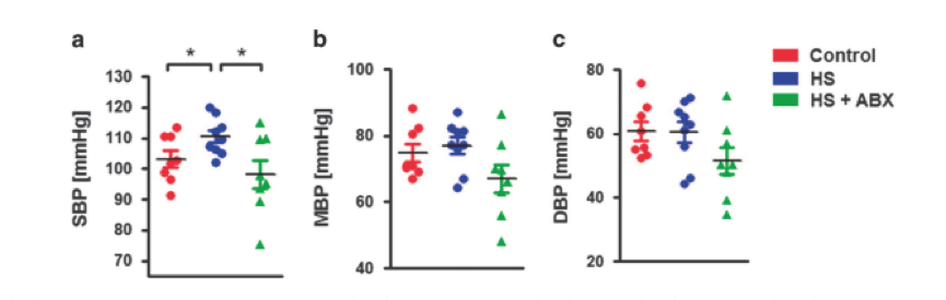 慢性HS喂養(yǎng)可能導(dǎo)致動脈壓升高,并且研究人員還檢測到抗生素如何影響這種進展。 如圖6所示,雖然HS處理的小鼠的DBP和平均血壓沒有增加,但是慢性HS喂養(yǎng)后SBP明顯升高。 有趣的是,抗生素治療能夠完全恢復(fù)海拔。 這些數(shù)據(jù)強烈表明慢性HS喂養(yǎng)引起的SBP升高取決于腸道微生物群。